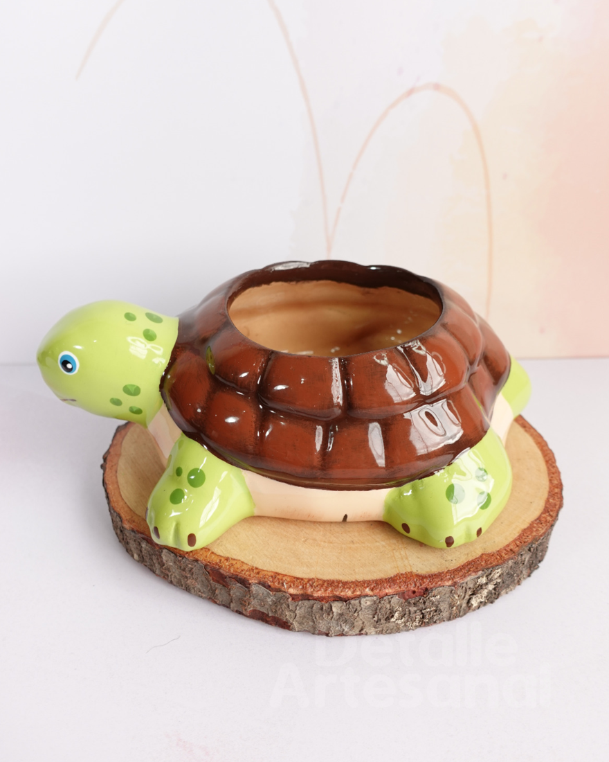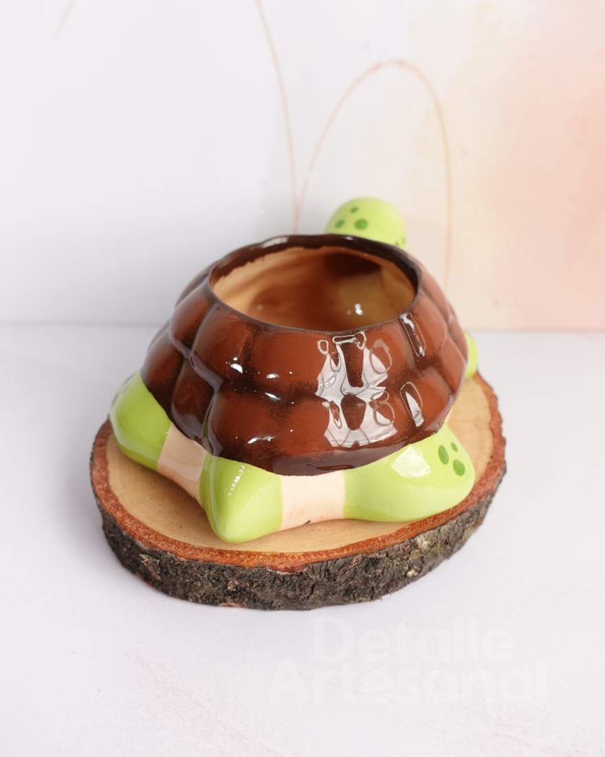 Matera en cerámica en forma de Tortuga terrestre, resinada e impermeabilizada para mayor protección al polvo y humedad. Vendría con planta natural*, piedritas decorativas, tarjeta de cuidados y bolsa de papel kraft. (La base de madera no viene incluida, sólo hace parte de la decoración de la imágen).