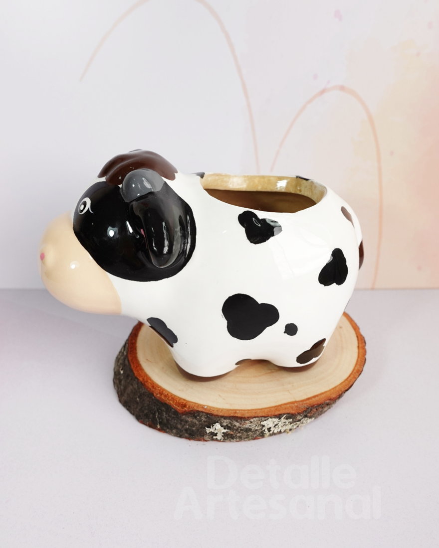 Matera en cerámica en forma de Vaca, resinada e impermeabilizada para mayor protección al polvo y humedad. Vendría con planta natural*, piedritas decorativas, tarjeta de cuidados y bolsa de papel kraft. (La base de madera no viene incluida, sólo hace parte de la decoración de la imágen).